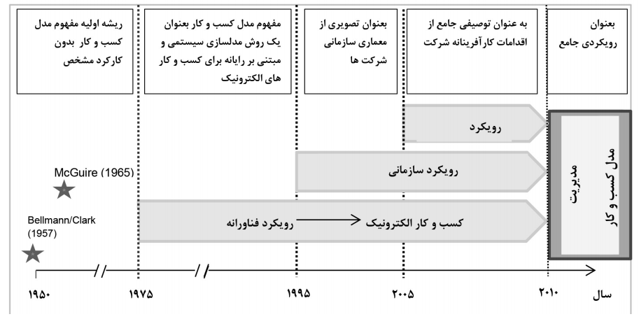 اصطلاح مدل کسب و کار از دهه هفتاد به تدریج مطرح شد و با افزایش استفاده از اینترنت میزان به کارگیری آن شدت یافت و تحقیقات زیادیحول این موضوع انجام پذیرفت. به طور خلاصه می توان سیر تحولات و افزایش و اهمیت مدل های کسب و کار تجارت الکترونیک را به صورت شکل ذیل نشان داد.